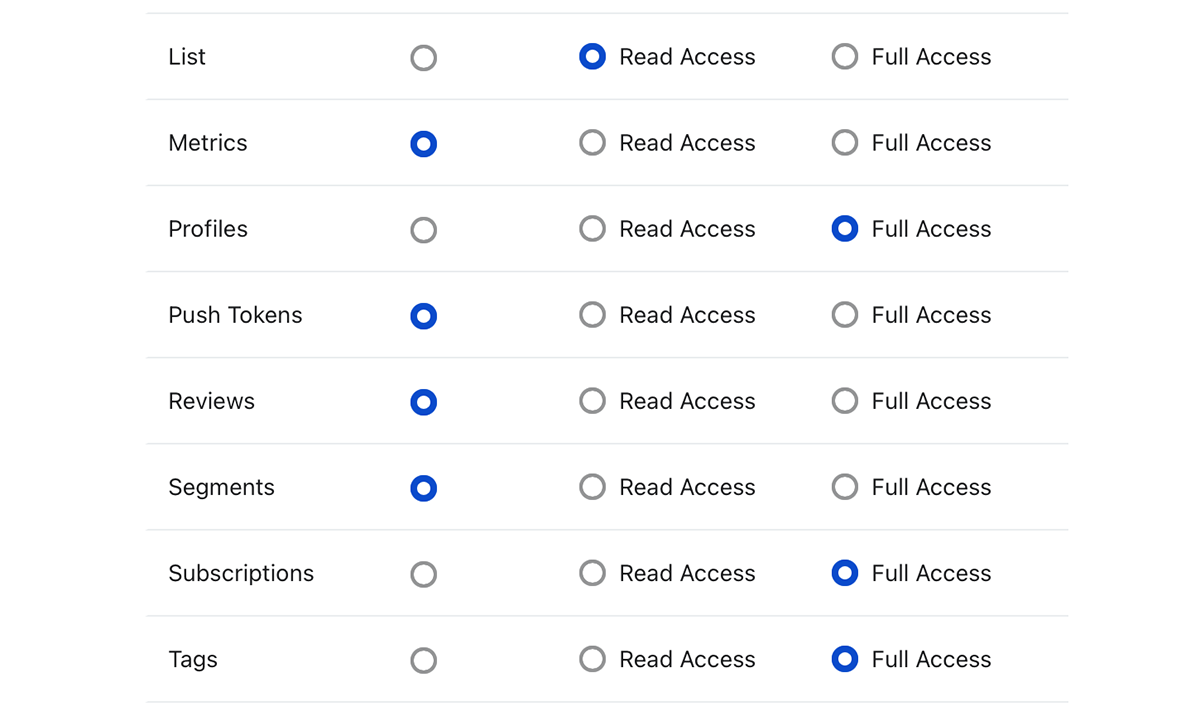 - Select either a Full Access Key or choose an API key with the following specific permissions: