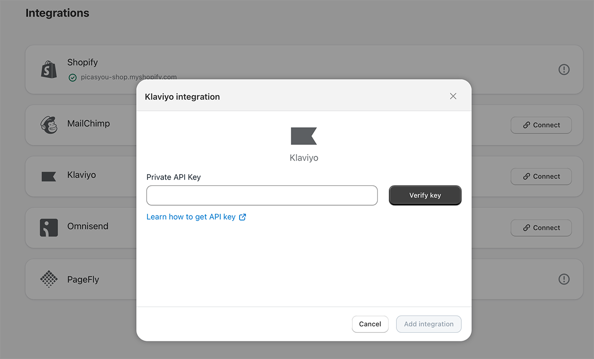 Enter your Klaviyo Private API Key. In a few seconds a successful connection icon will appear.