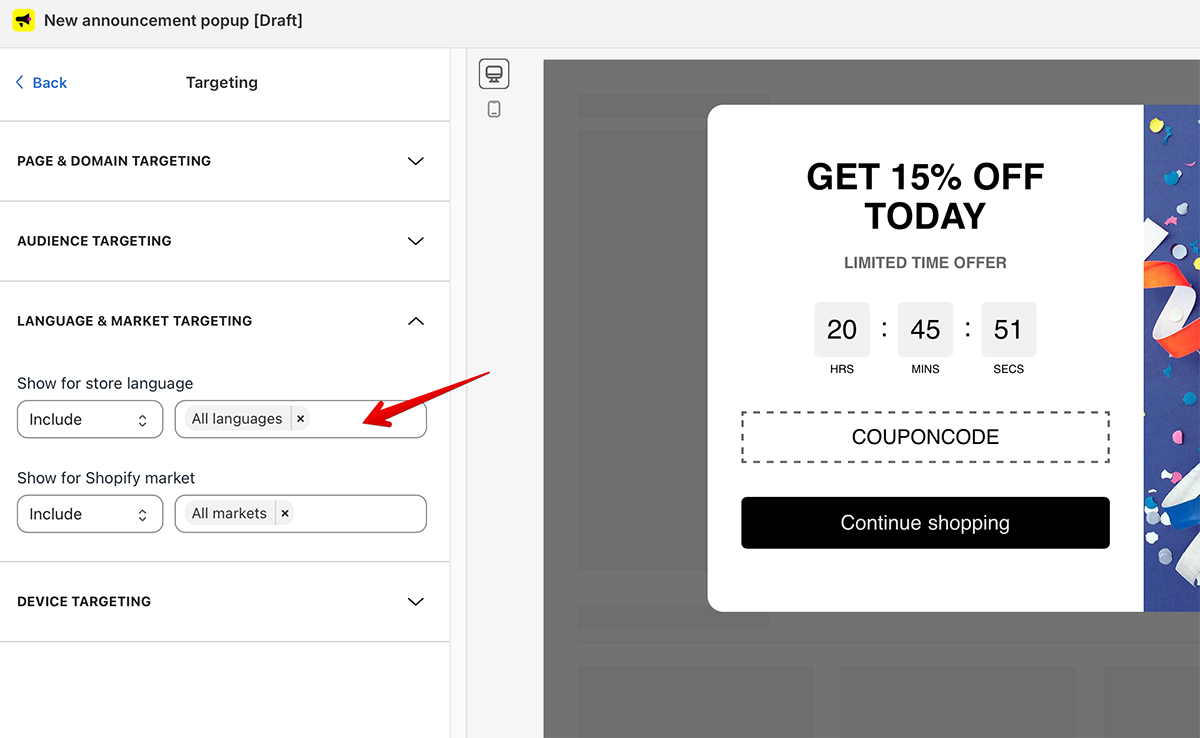 Alternatively, if you're not using Shopify's default translation methods, you can use our targeting feature to manually display each campaign only on its corresponding language-specific URL.
